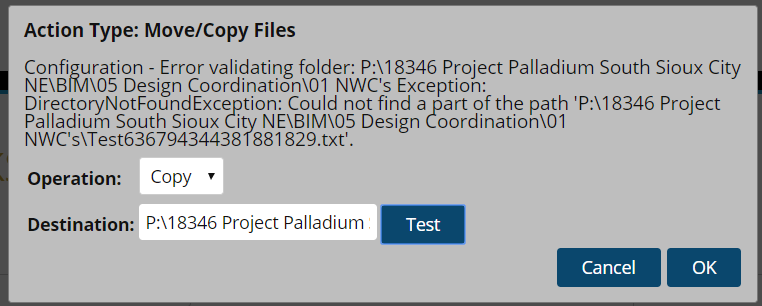 The other issue is that your Clarity web server is running as a particular user (if you have access, check the "Server" page) - that user must have access to the project folder in question... The Post Task Action tries to create a folder as that user - and it's not able to currently.