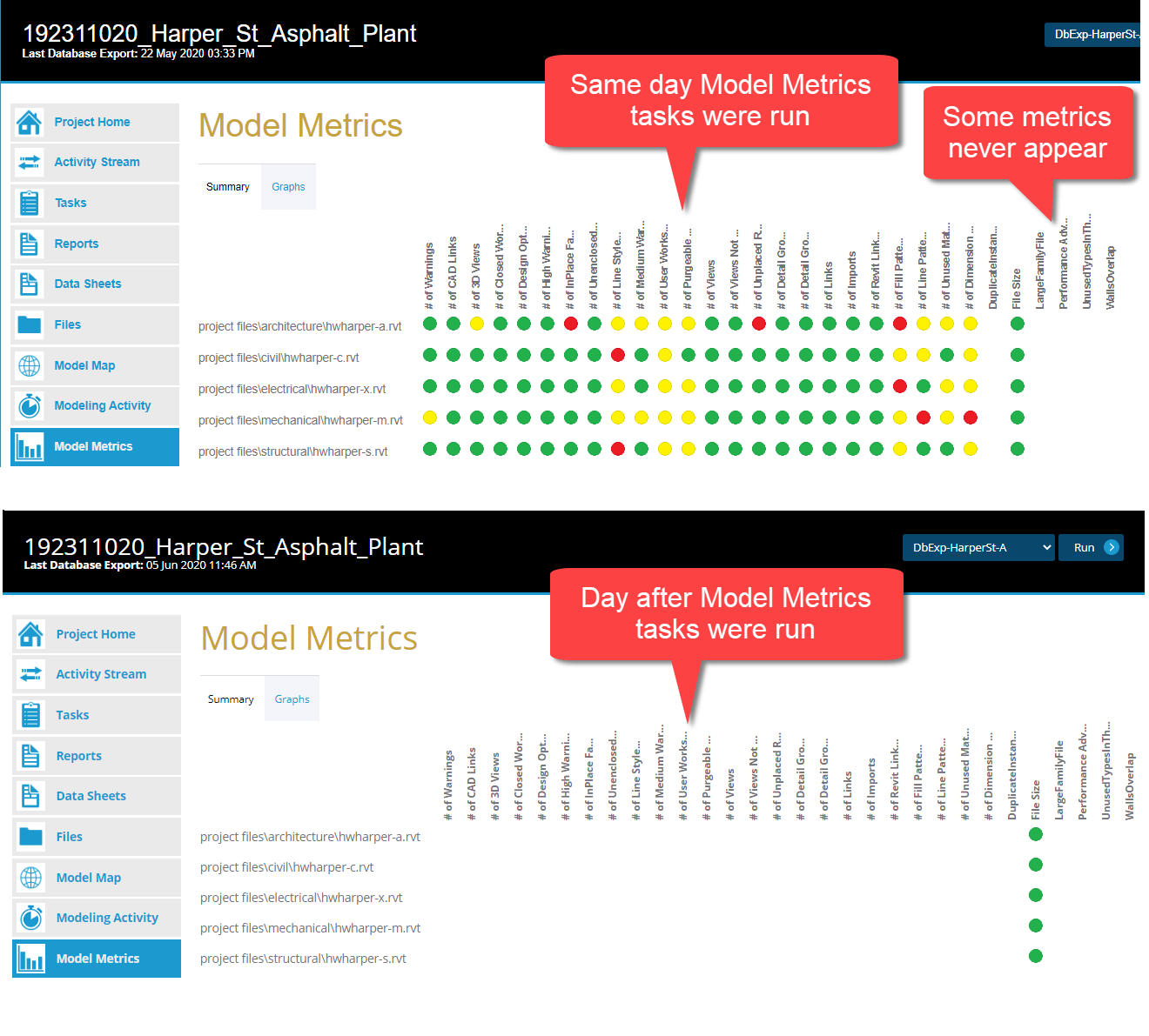 I have a similar situation with my Revit 2020 projects.  The model metrics data appears after the tasks are run.  But soon after it disappears.  See image below.  I have the admin logs, task server logs and journal files to share in a Zip file, but I'm assuming I can't post it hear.