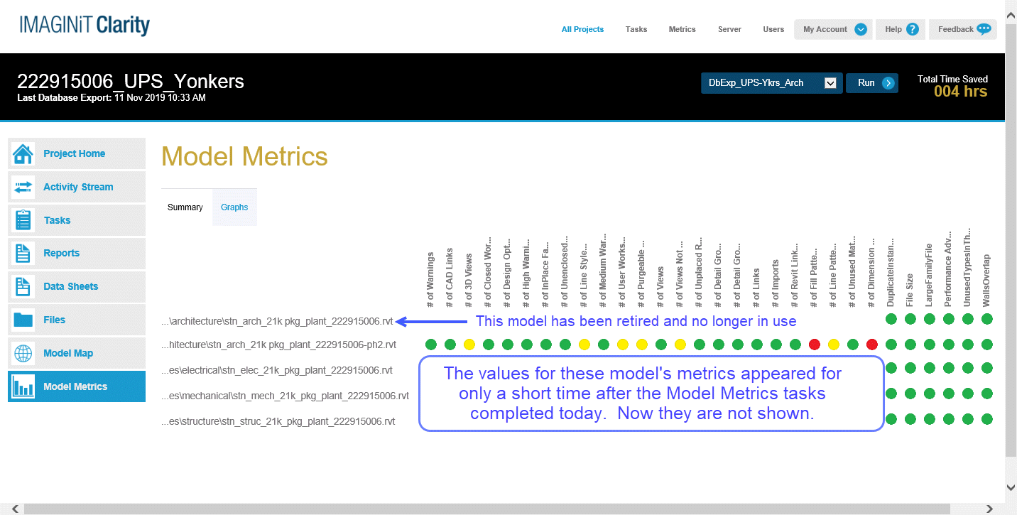 The model metrics summary for one of my projects is losing it's data display for 3 out of 4 models (on the project's Model Metrics page). I ran the metrics task on 3 of the models shown below, and the data graphics appeared (green, yellow or red dots)  .A short time later, the data graphics vanished and have not reappeared.   See image below.