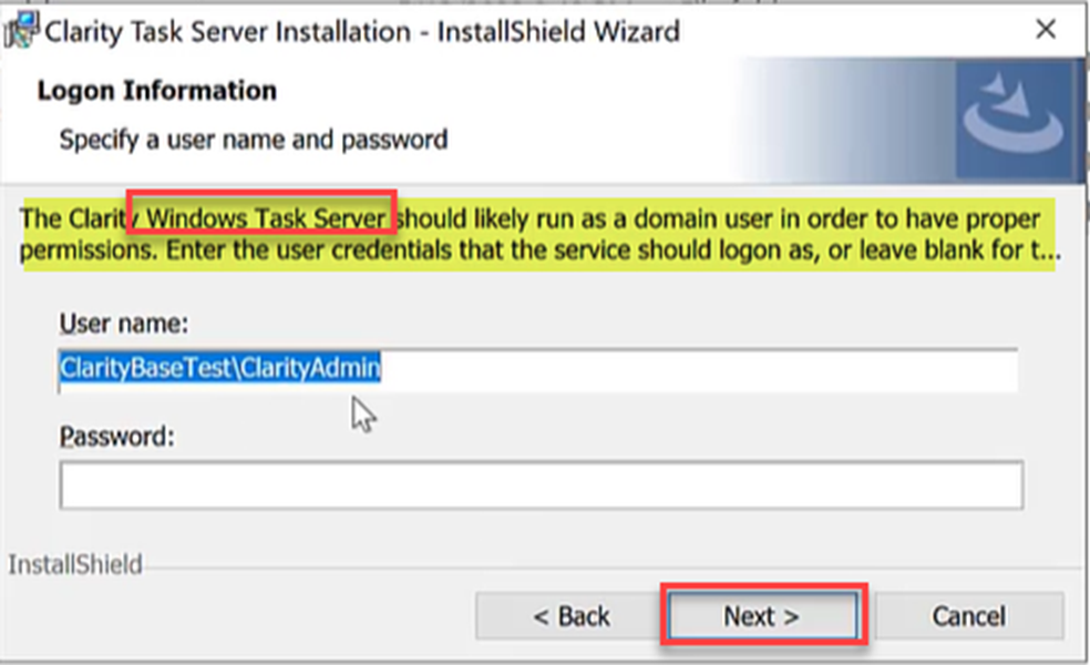 1. Enter the credentials and password used to run the Clarity Windows Task Server.