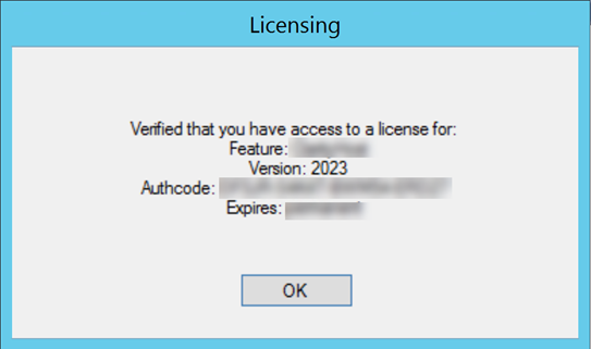 3. Rerun the license requester and enter the Authcode you were provided if you don’t already have a current license. If you already have a valid license you will see a dialog like this