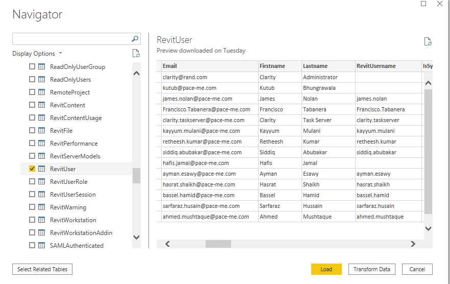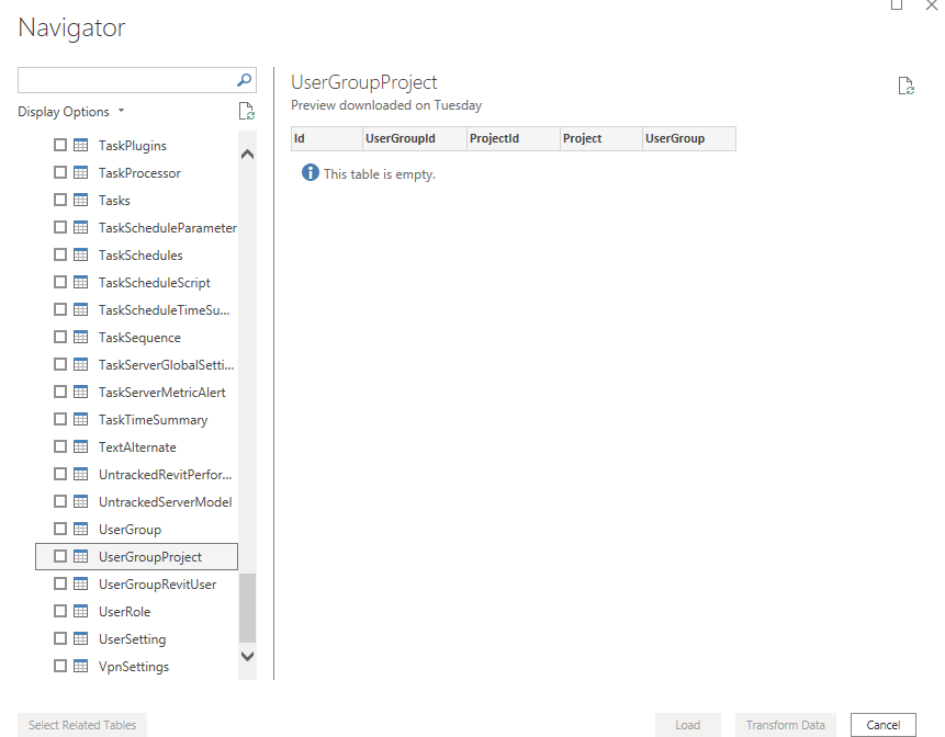 - There are some query tables that are empty. E.g. (Diagnostic chart, User group, User group project, User group Revit user)