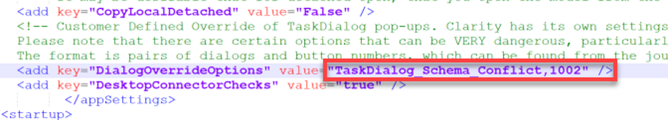 <add key="DialogOverrideOptions" value="TaskDialog_Schema_Conflict,1002" />