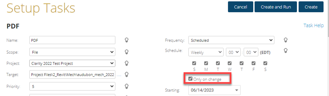 In addition to the priority, and the server and task server settings the task will run on the set schedule, unless, it is set to Only on Change. When set to only on change, it will only run at the scheduled time, if we see that the target model has changed for that model when the task is a File Scope. If the task is a project scope, the same is true, except if any model changed it will run.