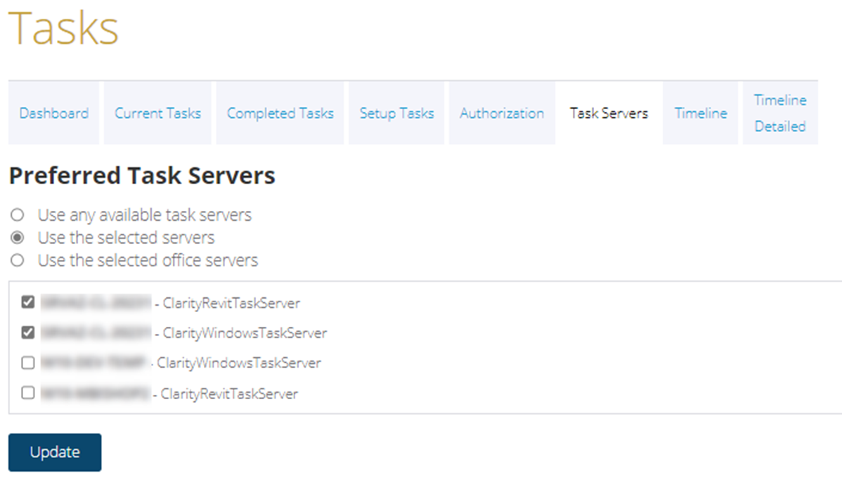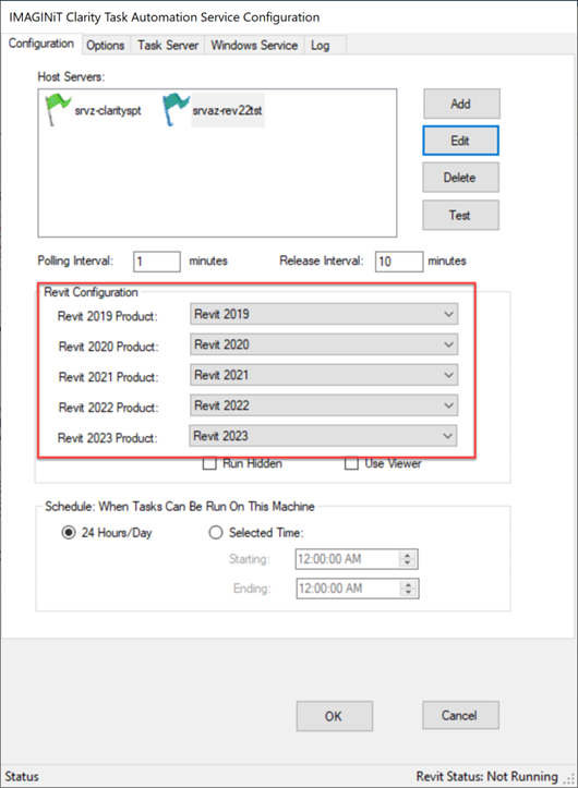 The task server Clarity version is also something to consider since not all versions support the same versions of Revit. Additionally, not all versions of Revit may be configured to run on the task server.