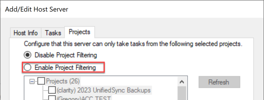 If you Enable Project Filtering, no tasks will process on that task server unless that project is checked. New projects do not automatically get checked, you would need to do that manually.