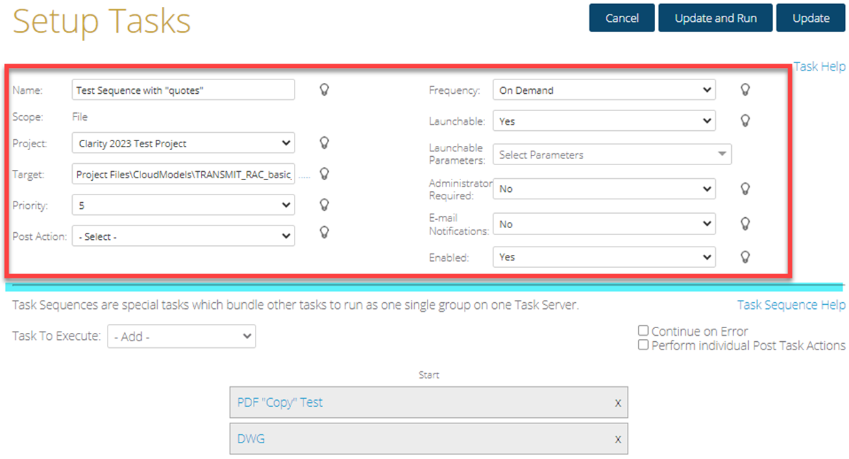 - For any configured Post Action on the individual task, you can set the Task Sequence to process the individual task actions. All of the files produced by all of the tasks in the Task Sequence will be compiled and processed by a Post Action configured on the Task Sequence.