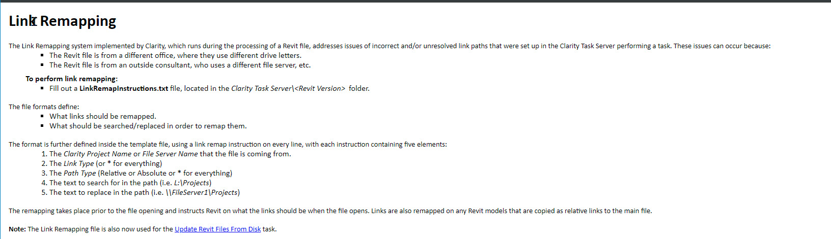 I am looking for a way to automatically link models after running an "Update Revit Model from Disk" task.  The very last option is a "Re-map Links".  Which states the option is to, "change the mapping of the links, based on the remap file on the task server."  See the attached file for the only mention of the LinkRemapInstructions.txt file that I can find.