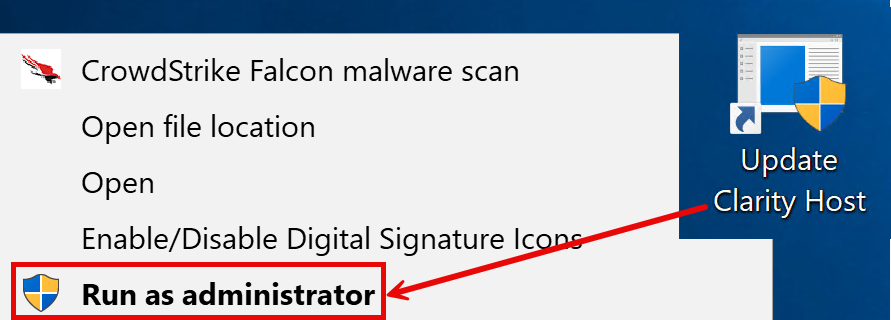 Right click on the desktop icon Update Clarity Host, Run as Administrator