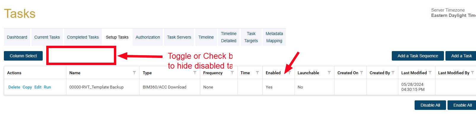 Could a toggle be added to the tasks page within the projects to hide all the tasks that are currently disabled in the project? Some projects have a few dozen tasks setup and hiding the disabled tasks would help clean up the list. The filter at the top of the column is nice be it resets to easy. Could this be a project based setting or user based setting so it would be persist if the user left the page or logged out?